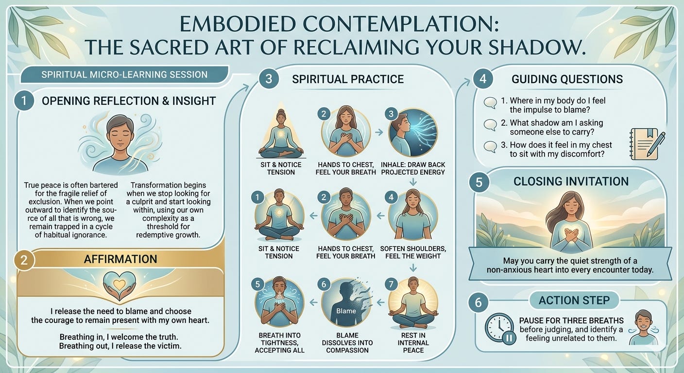 Transformation begins the moment we stop looking for a culprit and start looking within. By choosing to hold the pain of our own complexity rather than passing it on, we break the mechanism of blame that fuels collective violence. This shift requires us to descend from the head into the felt reality of the body, where we can cultivate a mature conscience. Here, we discover that suffering is not something to be exported, but a threshold for redemptive growth that can finally dissolve the illusions of the ego and lead us toward a genuine, shared wholeness.